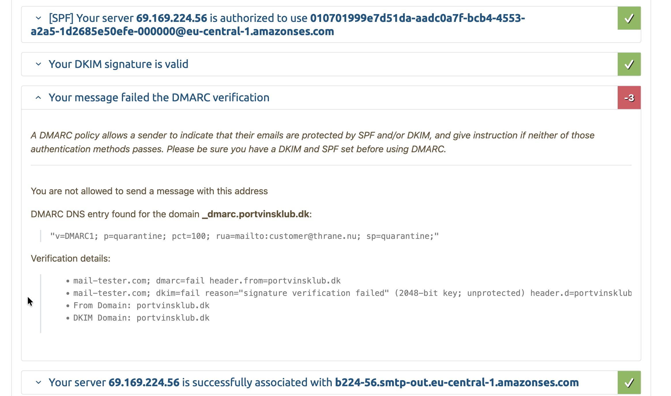 After making the change wait for the dns record to fully propagate and then run the mail tester again.