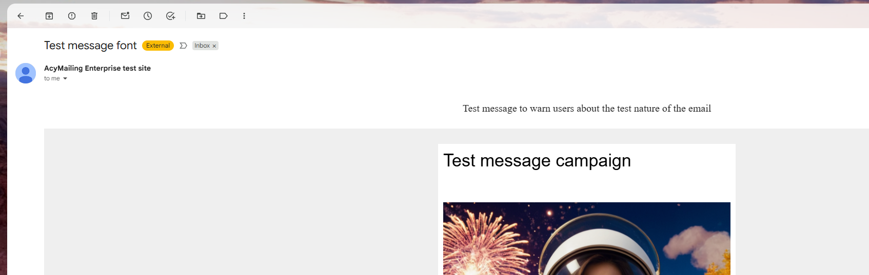 When I do a test sending of a newsletter in the "Tests" tab, under "Send test email to:", I have to enter a message to inform the recipients that it is a test. This message, when it arrives to the recipient, appears in a font that I find inconsistent because it is very flashy, italic, and decorative. How can I change the font of this message?